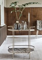 Mesa auxiliar de hierro con 2 estantes de mármol de color marrón y beige hechos a mano.. Una pieza must-have en esta temporada.